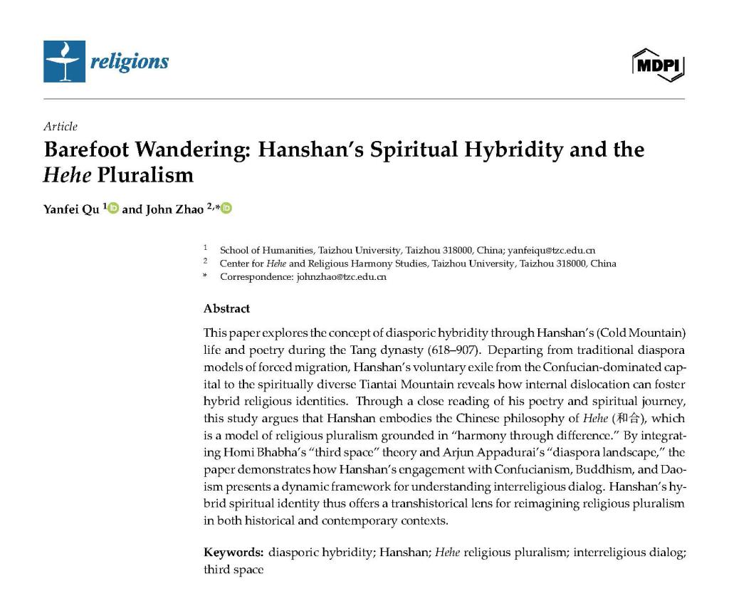 本院讯我院屈燕飞副教授与马克思主义学院赵轩博士合作完成的论文《芒鞋踏歌:寒山灵性之融与和合之境》(Barefoot Wandering:Hanshan's Spiritual Hybridity and the Hehe Pluralism)近日正式发表。该研究突破了传统宗教多元论的西方理论框架,首次系统性地阐发了“和合多元主义”(Hehe Pluralism)这一植根于中国思想传统的理论范式,为全球宗教哲学研究贡献了中国智慧。