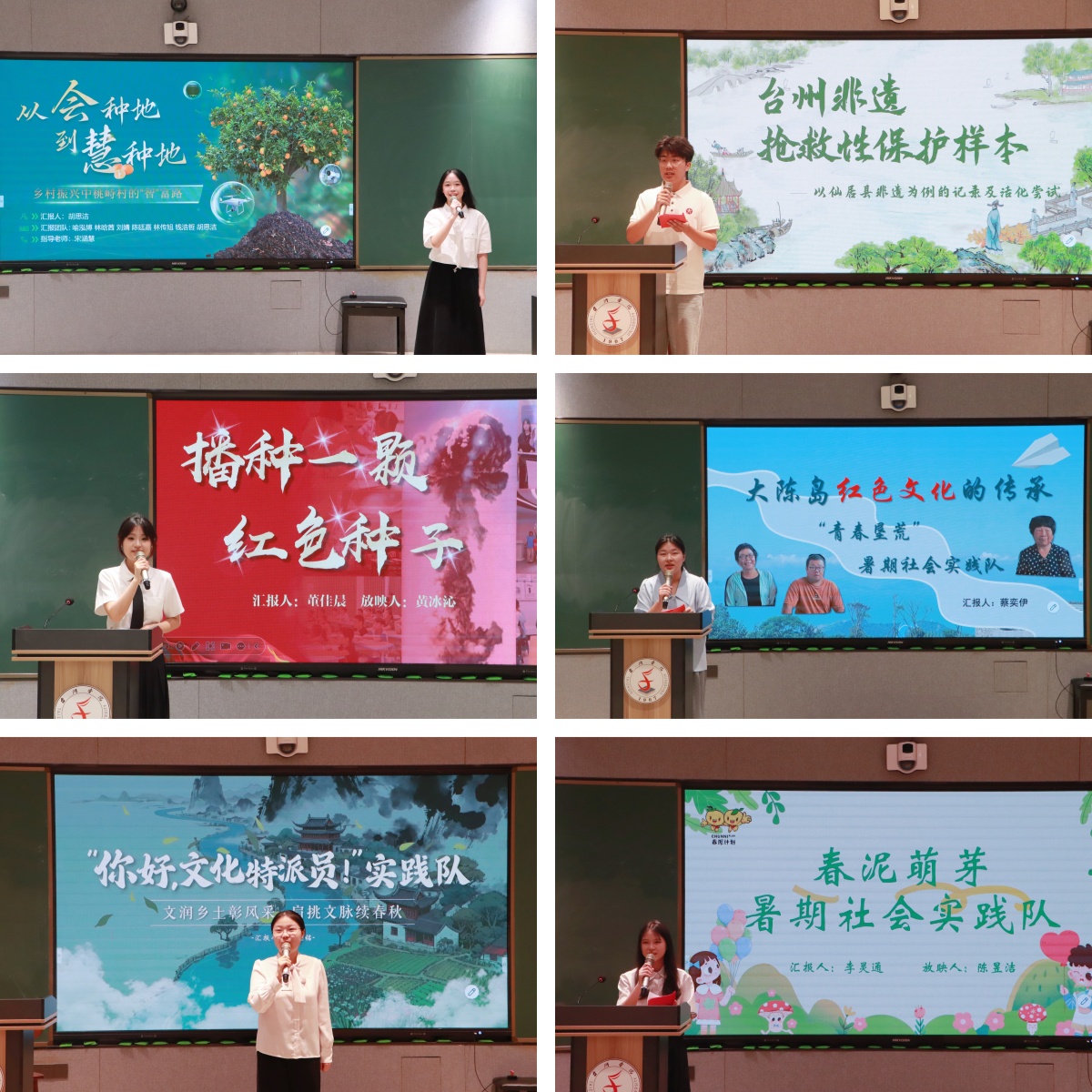 评选会上,18支实践团队依次进行展示,通过PPT讲解、视频展播等多种形式,围绕实践背景、实施过程、项目亮点与社会意义等方面作了生动汇报。其中,“书香义城”实践队深入乡村教育一线,以书香陪伴助力儿童成长;“浙东唐诗之路”实践队紧扣文化强国战略,探寻古越文化脉络,以唐诗为载体激活地方文化基因;“新农人”实践队走进乡村,调研智慧农业发展与新农人培育路径,为乡村振兴提供现实参考;“和合文化”实践队通过沉浸式调研,深入挖掘“和合智慧”的当代价值;“你好,文化特派员”实践队总结文化特派员在活化乡土资源方面的实践经验,助力文化赋能乡村振兴;“青春垦荒”实践队走进大陈岛,在红色热土上传承垦荒精神。