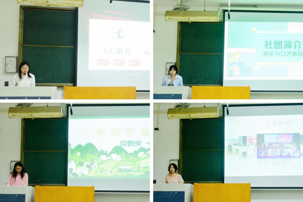 宣讲会上,各大社团各展风采,以独特魅力吸引新生关注。GC剧社通过丰富多彩的戏剧活动,邀请新生共同体验表演艺术的魅力。鹿路文学社以“期刊征稿”“文坛新秀杯”等品牌活动,为热爱文学的同学搭建交流与展示的平台。文渊汉学社通过“汉服走秀”等特色活动,让传统文化在校园中焕发新生。电影学会聚焦“微电影创作”“剧本撰写”等实践内容,助力同学们用镜头记录青春。书法协会邀请优秀指导教师现场授课,让同学们在墨香中颐养性情。辩论与口才协会以思维的碰撞与语言的交锋,邀请学子在此磨练表达、勇敢发声。历史学社带领同学们畅游历史长河,汲取智慧精华。风雅诵读社则通过“名家经典诵读”“推普晚会”等活动,让文字在声音中焕发新的生命力。