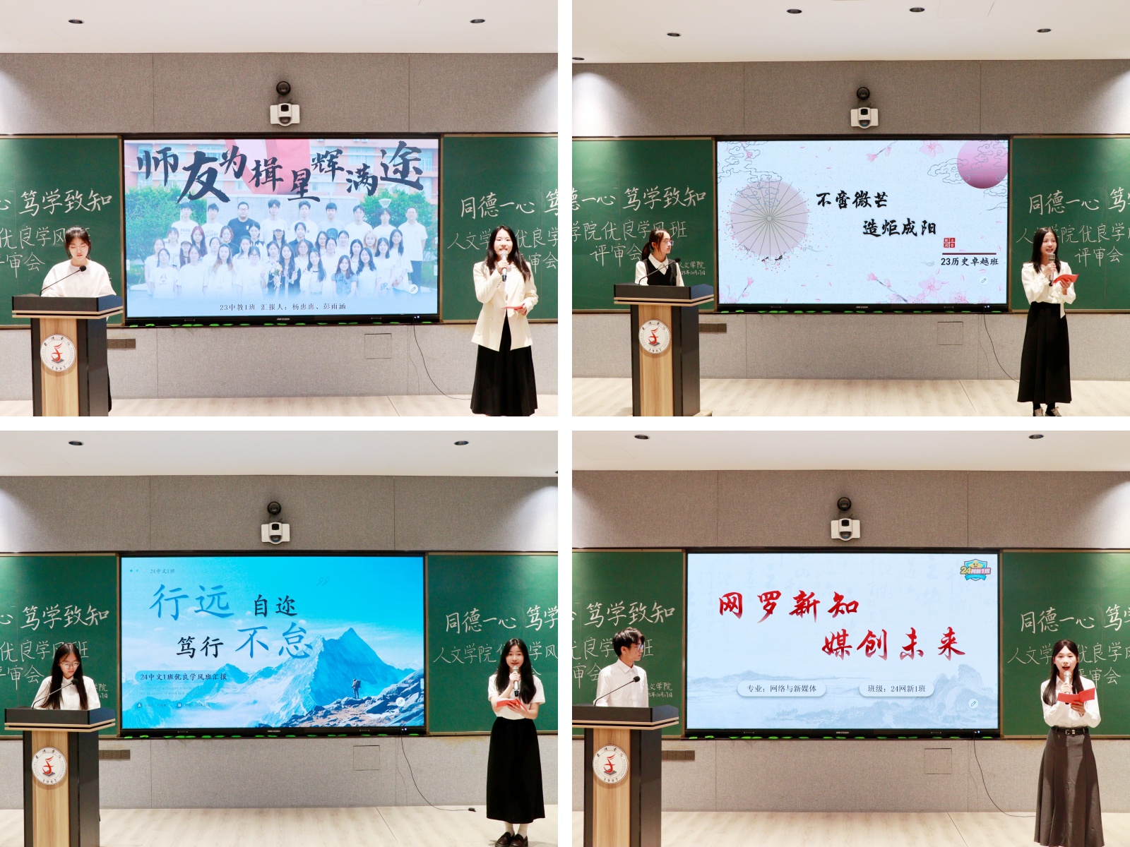 评审会上,各班级代表依次上台展示,结合精心制作的视频与PPT,围绕学风建设、学科竞赛、志愿服务、寝室文化等多个方面,全面呈现班级建设成果与特色风采。他们用详实的数据、生动的图片和真挚的讲述,展现了人文学子在专业学习、科研创新、社会实践等多维度的成长与突破,传递出笃学力行、互助共进的班级风貌。
