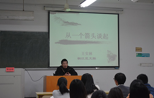 11月13日晚,中国作家协会会员、浙江省作家协会全委会委员、台州市作家协会副主席王安林先生应邀来校讲学,讲座以“从一个箭头谈起”为主题,向在座的师生传授了散文的魅力。 王安林先生曾在《小说选刊...